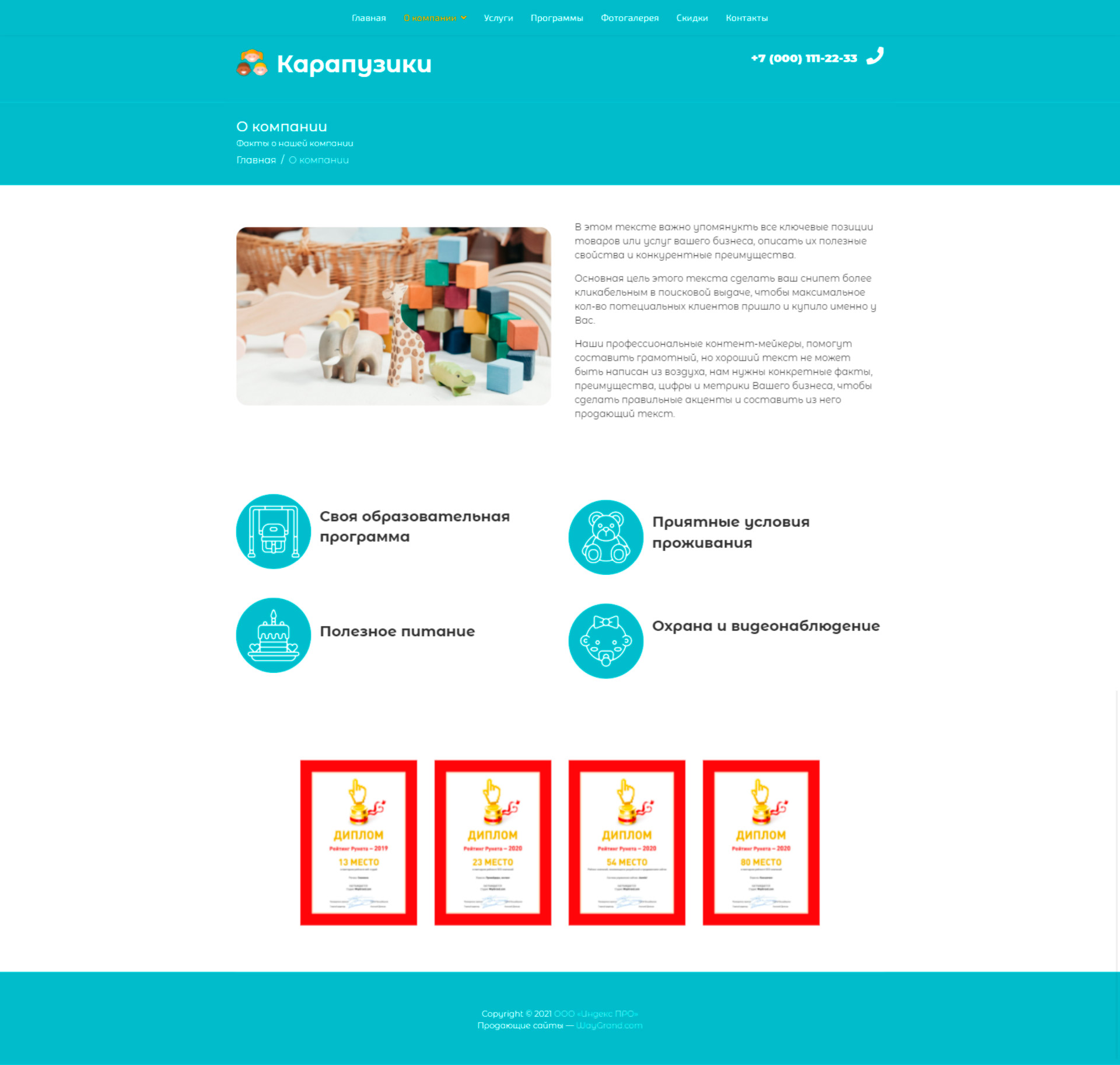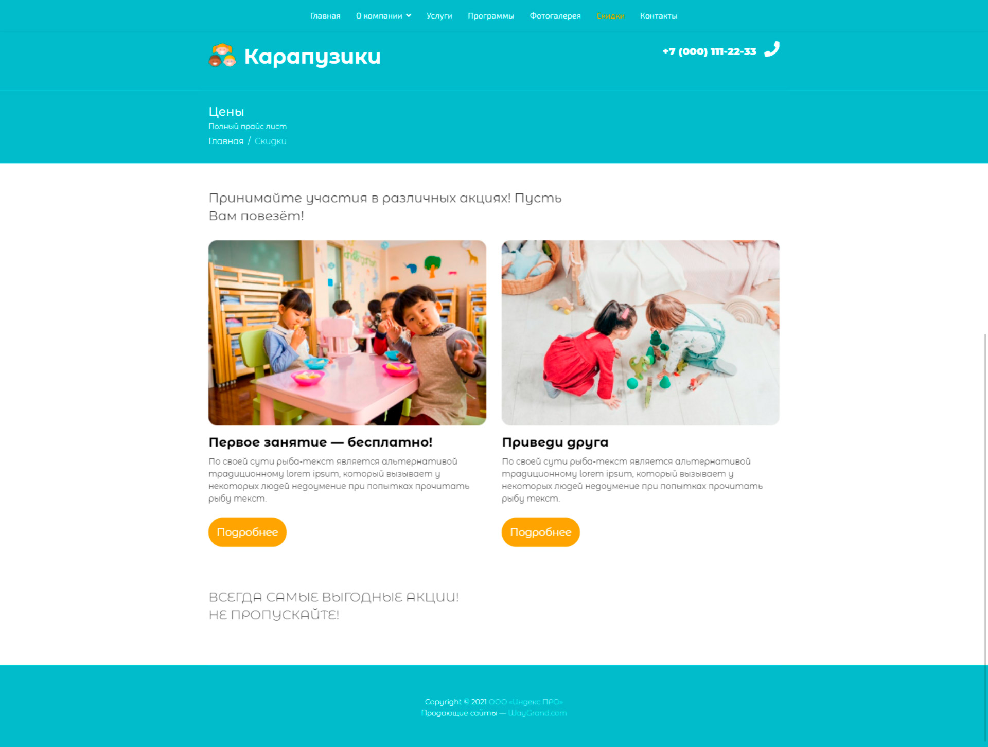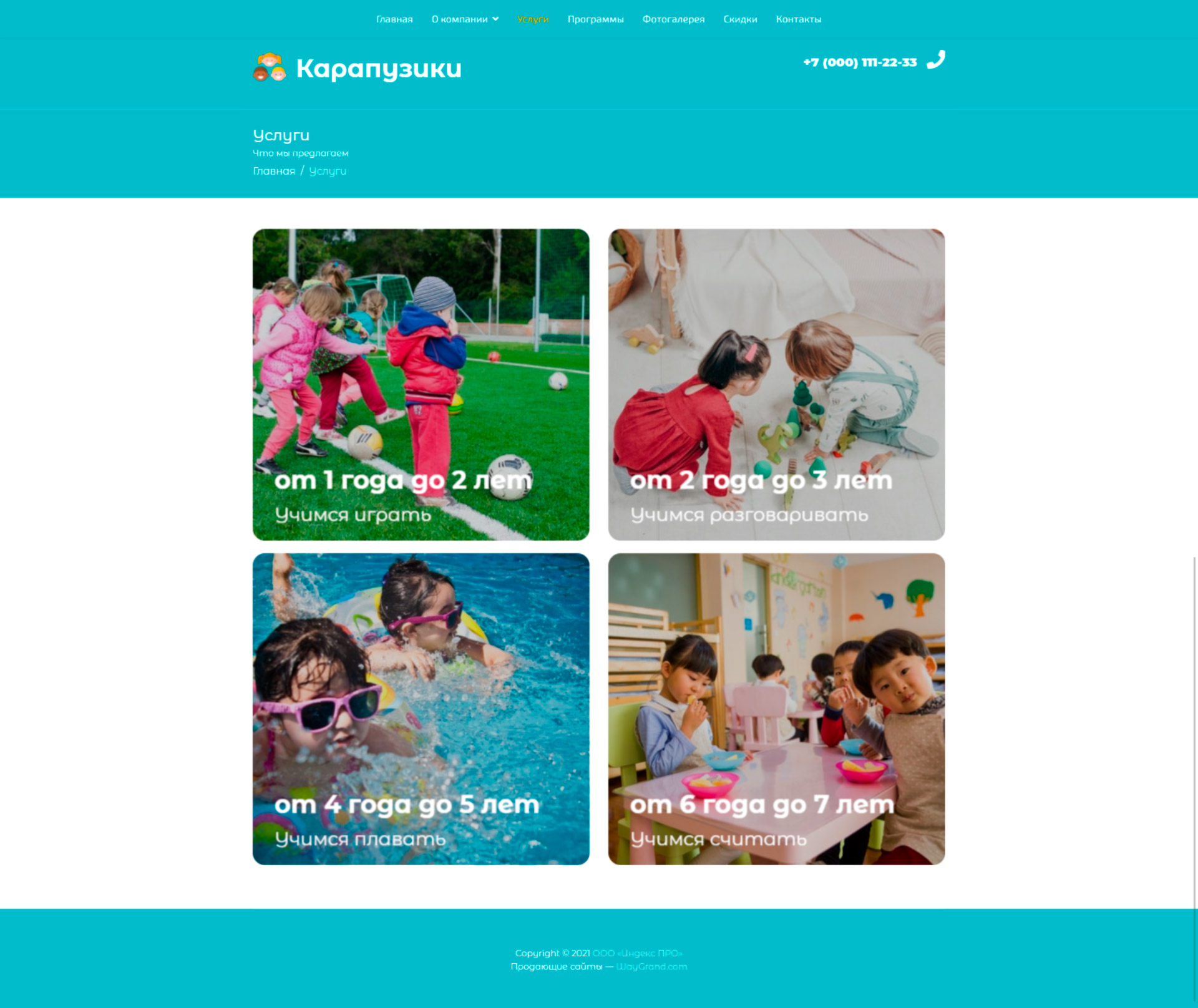 Закажите готовый продающий сайт визитка #0419301 в Архангельске за 5-7 дня «под ключ»: свёрстан, отрисован и готов к рекламе. Тематика шаблона «Частный детский центр».