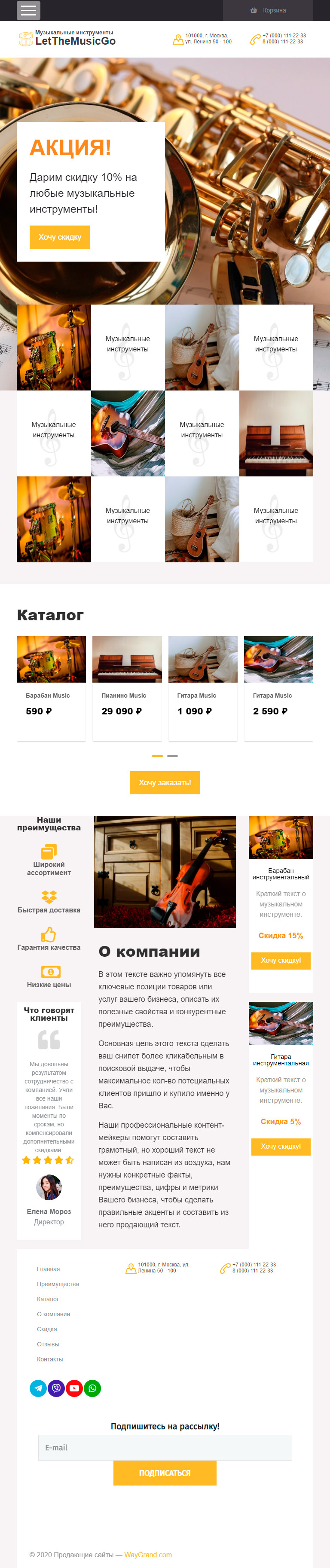 Закажите готовый продающий сайт лендинг #0710201 в Архангельске за 1-3 дня «под ключ»: свёрстан, отрисован и готов к рекламе. Тематика шаблона «Музыкальные инструменты».