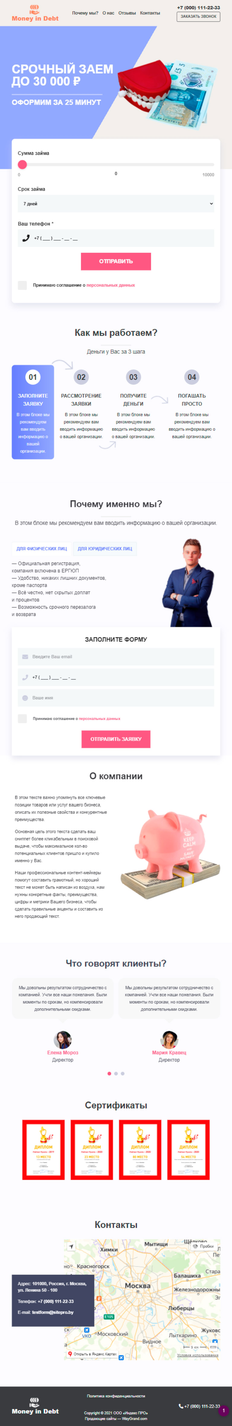 Закажите готовый продающий сайт лендинг #2825202 в Архангельске за 1-3 дня «под ключ»: свёрстан, отрисован и готов к рекламе. Тематика шаблона «Деньги в долг».