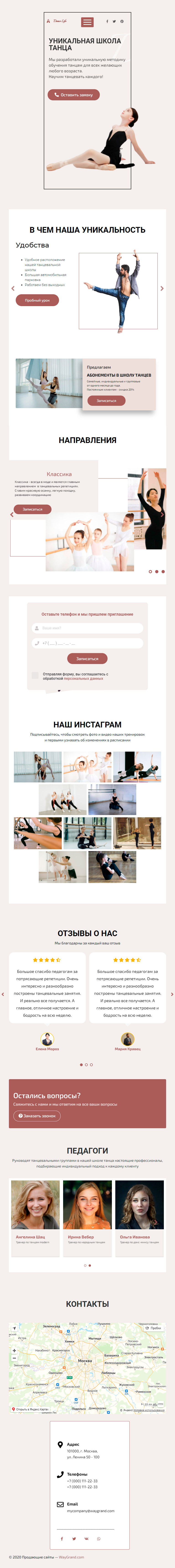 - Промоблок "Уникальная школа танца" с кнопкой призыва к действию "Оставить заявку"